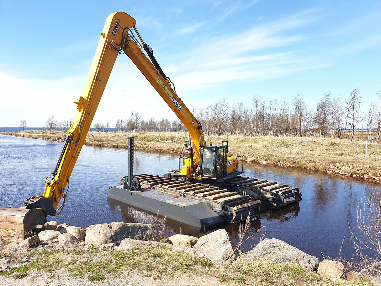 Bandgående underredessystem som gör det möjligt för grävmaskiner och borriggar att arbeta i våtmarker, vattendrag och grunda vattenområden. Ger stabil rörlighet både på land och i vatten tack vare modulär pontonkonstruktion.